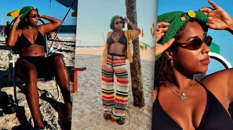A escolha da nutricionista foi um biquíni da cor preta, complementado por um detalhe que é sua marca registrada: chapéu de crochê verde, acessório muito usado durante o confinamento.
